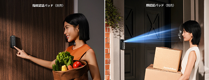 別売りの顔認証パットや指紋解錠パッドなどと連携すれば、iPhoneと同じ3D顔認証や指紋認証、手ぶら解錠、交通系ICカード(Suica/PASMO)を用いた解錠などが可能になります。解錠スタイルは20パターン。雨の日に傘を持っていたり指が濡れていたりしたら顔認証、荷物で手が塞がっていたら肘で「ピッ」として解錠するなど、使う人やシーンに合わせてお好きな方法で鍵を開けられます。指紋認証は100人まで登録可能なので、オフィスでの導入もおすすめです。